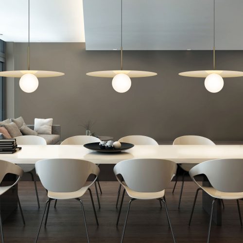 The slim disc form distributes light evenly while maintaining a minimal profile. It feels modern, intentional, and refined, bringing both drama and balance to a room.