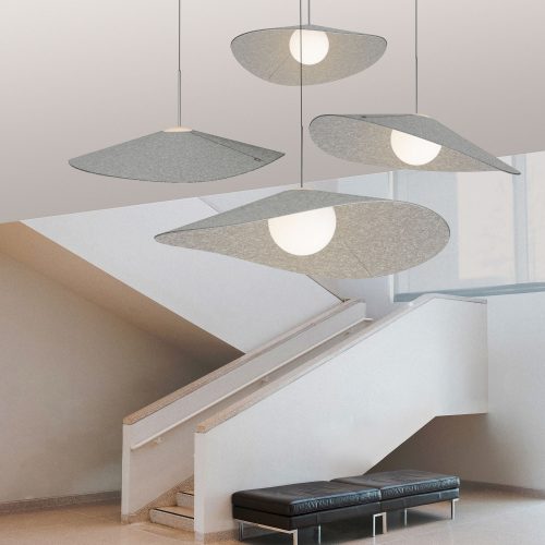 Wrapped in soft felt, this fixture introduces texture overhead while helping absorb ambient sound—making it ideal for collaboration areas, open workspaces, and shared community zones. The felt creates a warm, inviting aesthetic while also contributing to improved acoustic comfort.